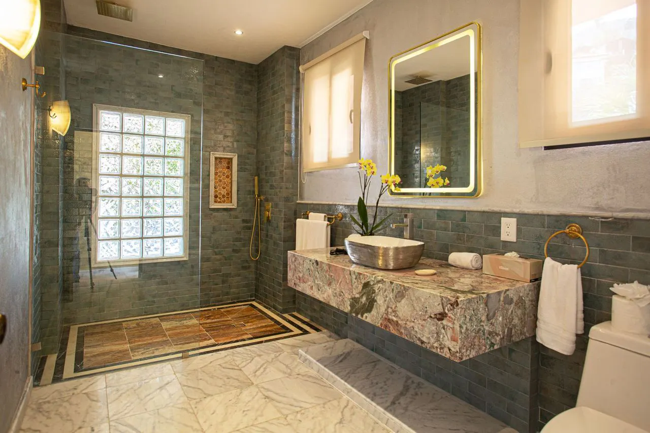 The en-suite bathroom offers a spa-like experience with rich green tilework, a walk-in rainfall shower, and a striking stone vanity.