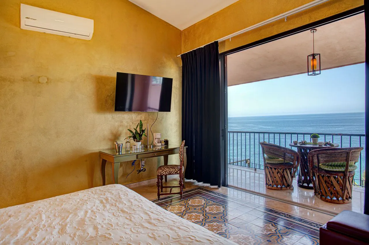 This elegant oceanfront suite features a spacious bedroom with a king-size bed and direct access to a private balcony overlooking the sea. Floor-to-ceiling sliding doors fill the room with natural light.