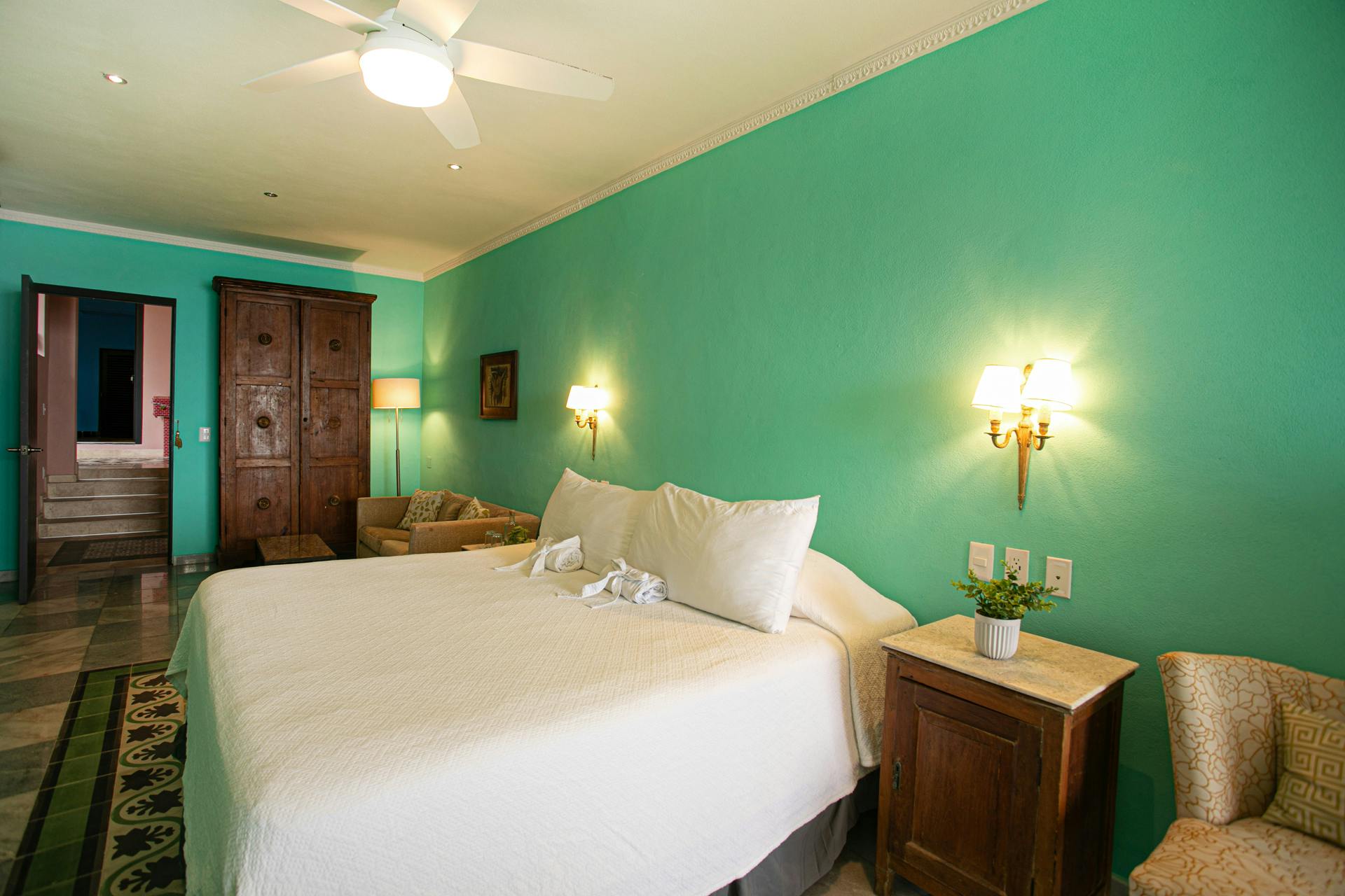 This spacious ocean-view suite features soothing turquoise walls, a comfortable king bed, and a cozy sitting area for relaxing indoors. Large doors open to a private balcony where you can enjoy ocean breezes and sea views.