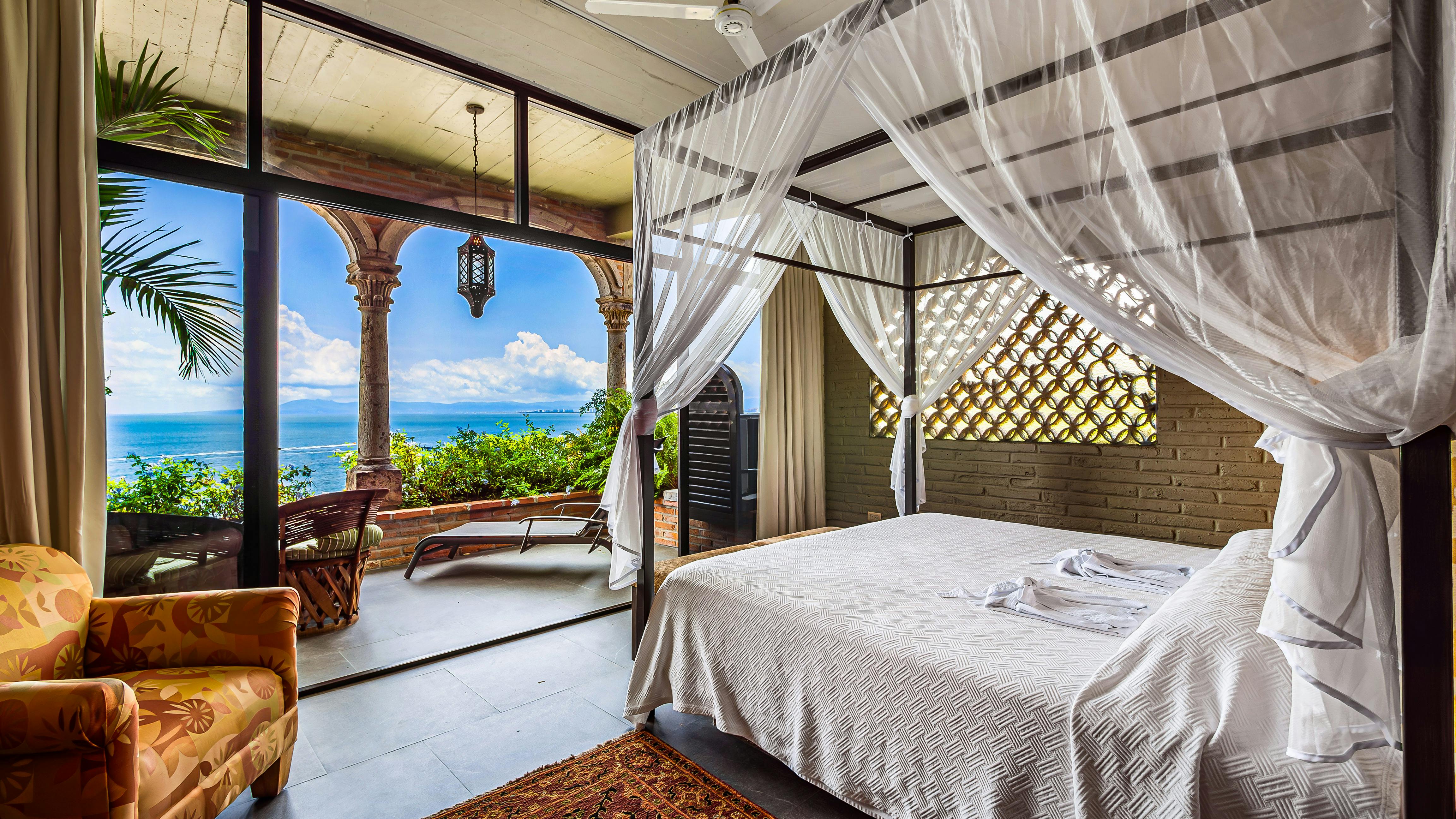 This bedroom offers a king-size bed, air-conditioning and newly remodeled bathroom with double-sinks and a large shower. It also features a large private terrace with views of the bay and north towards the lights of Puerto Vallarta.