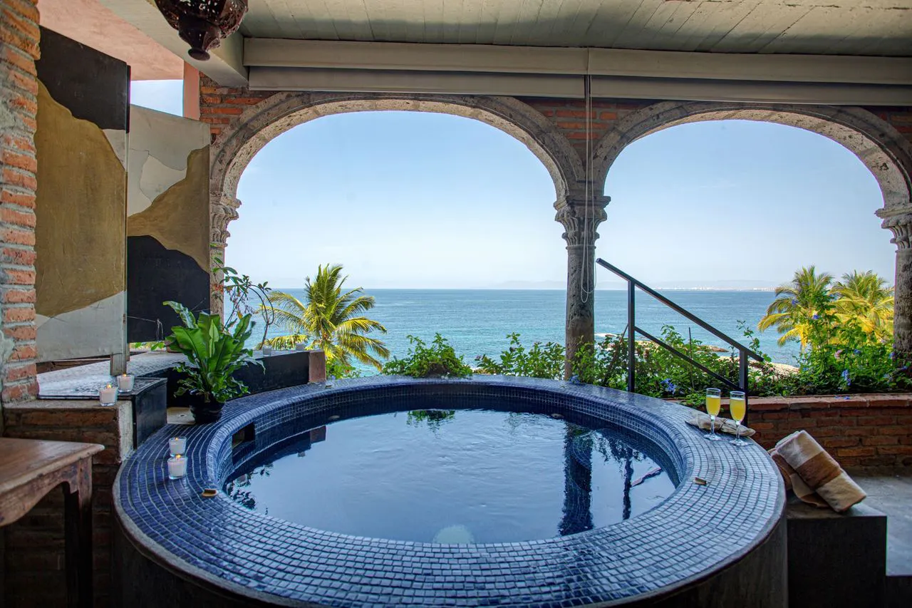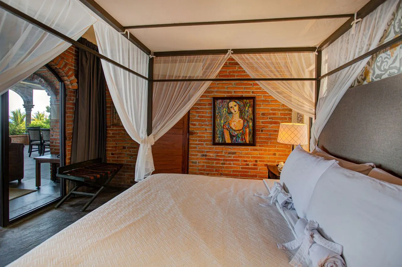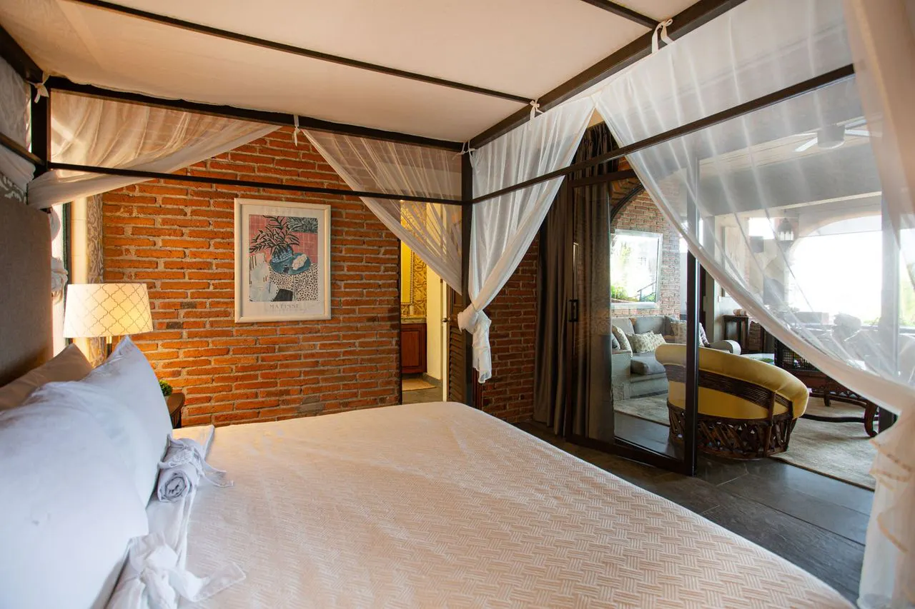 This room features an open-air living, dining, kitchen and jacuzzi framed by hand-carved cantera columns and arches with spectacular views. King-size bed with air-conditioning and private bathroom. Glass door for an ocean view thru the living area.
