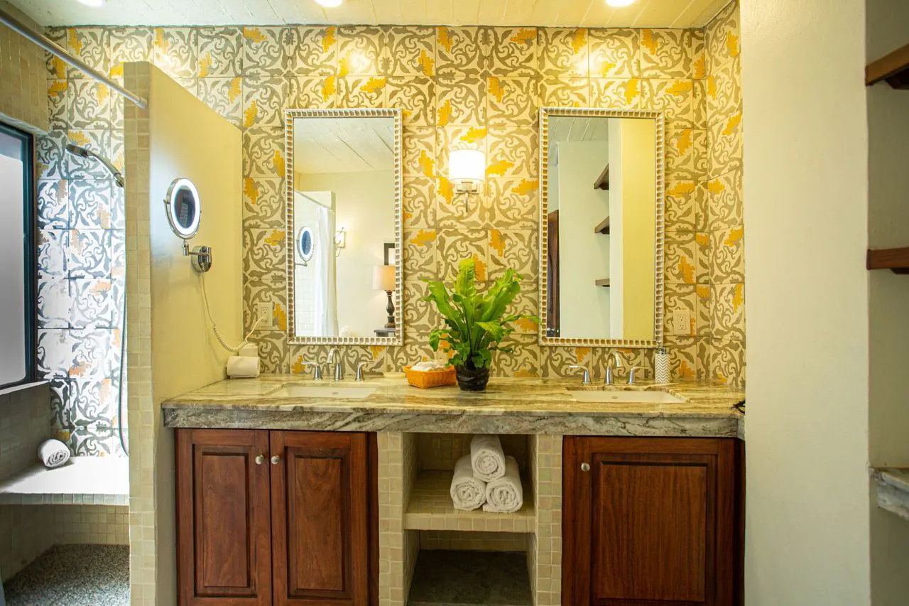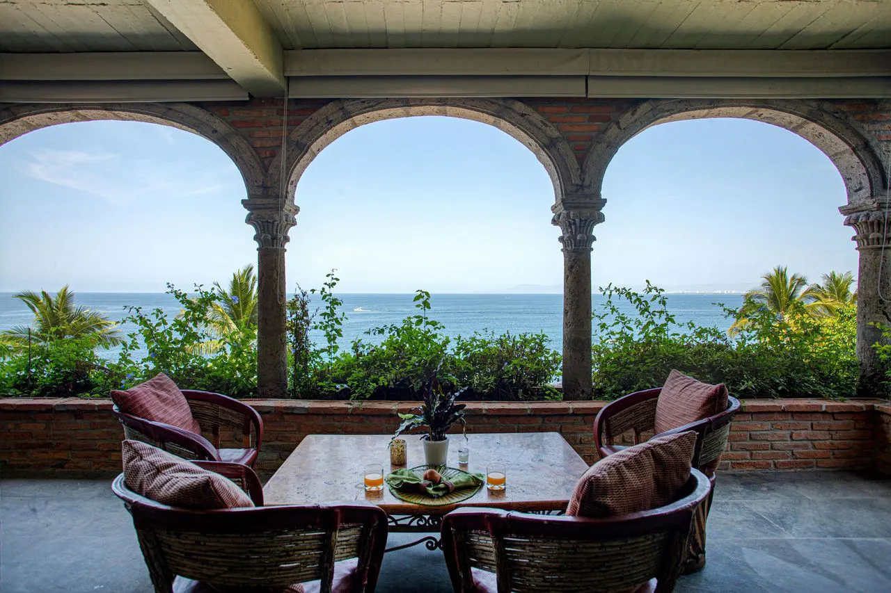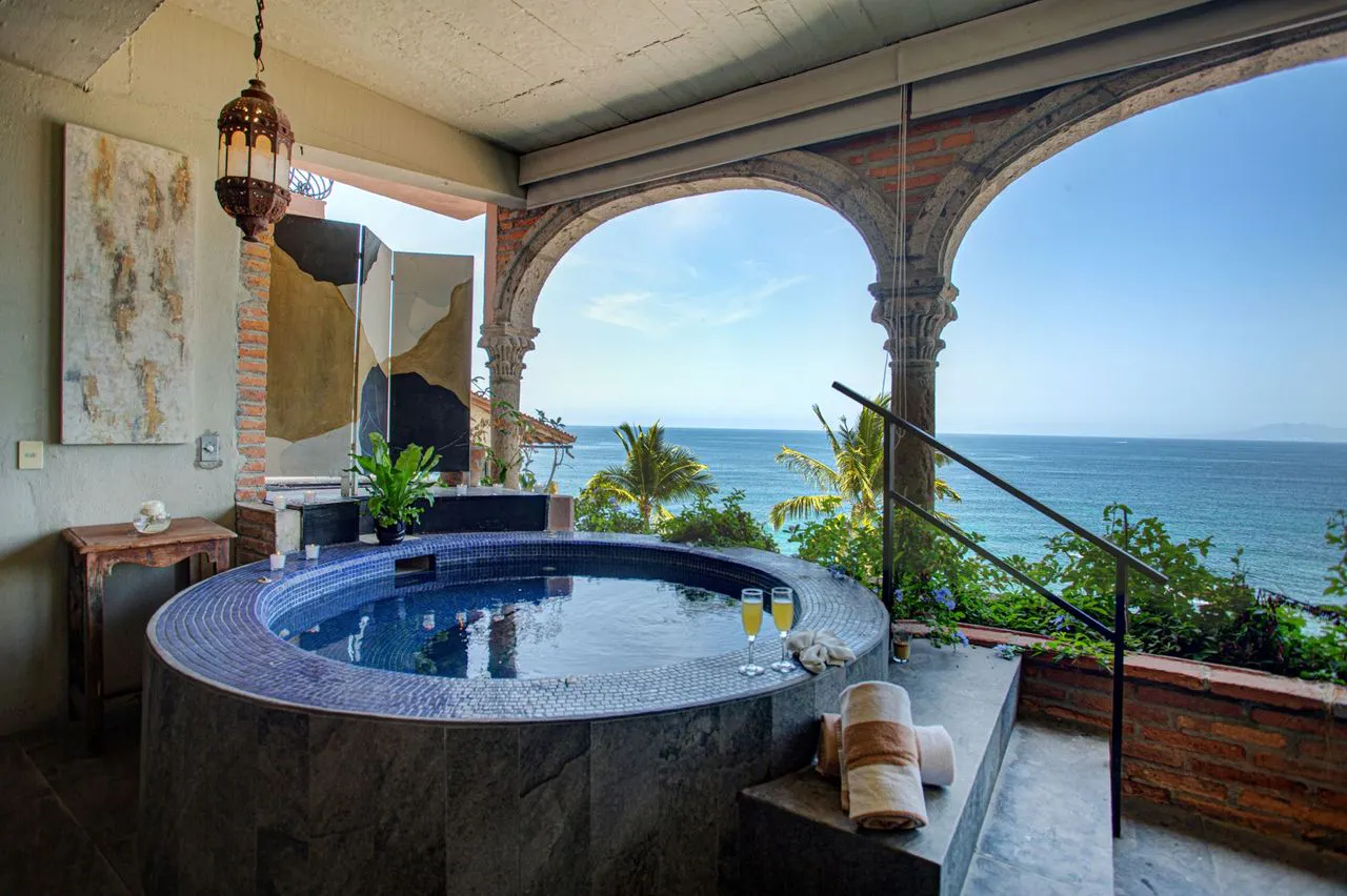 This room features an open-air living, dining, kitchen and jacuzzi framed by hand-carved cantera columns and arches with spectacular views. King-size bed with air-conditioning and private bathroom. Glass door for an ocean view thru the living area.
