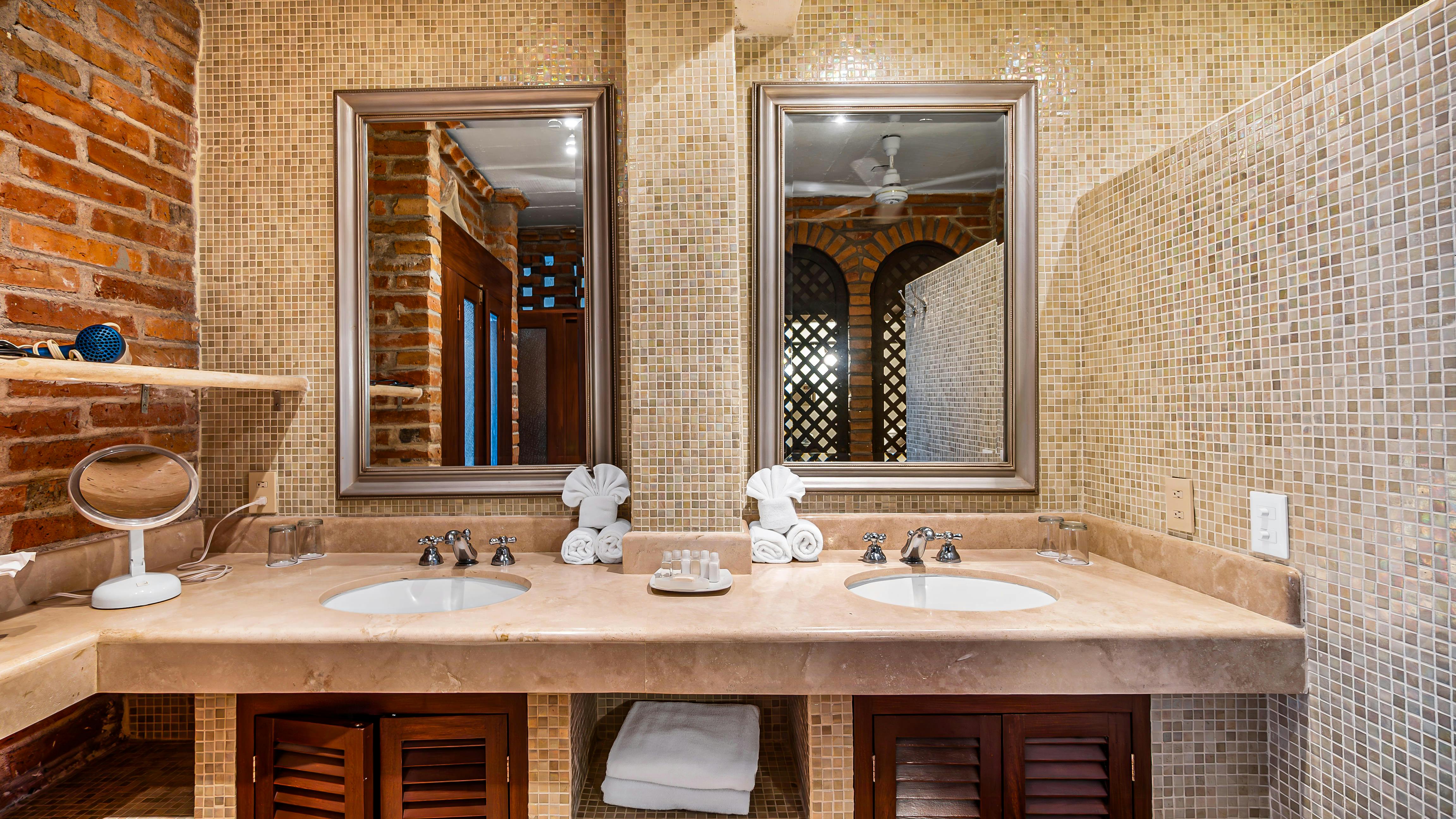 This air-conditioned bedroom, has two king-sized beds, a large private bath with double vanities, and a balcony with ocean views that connects to a terrace with sitting area. It also has a mini-fridge and coffee maker.