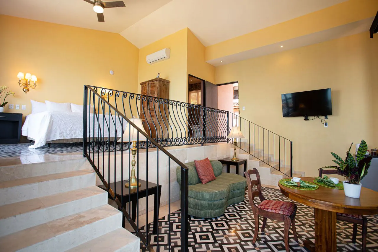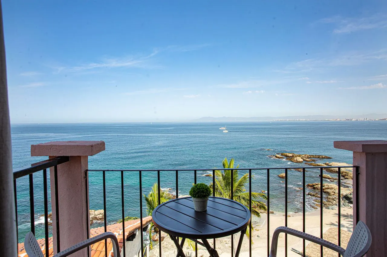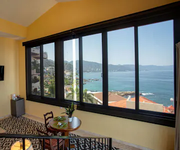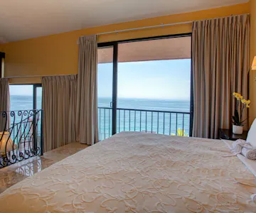 Located on the highest floor, this room offers breathtaking 180-degree ocean views from a private balcony. The spacious room features a plush king-size bed, warm golden walls, and elegant lighting for a relaxing coastal retreat. Floor-to-ceiling sliding glass doors fill the space with natural light, creating the perfect setting to unwind while overlooking the sea.