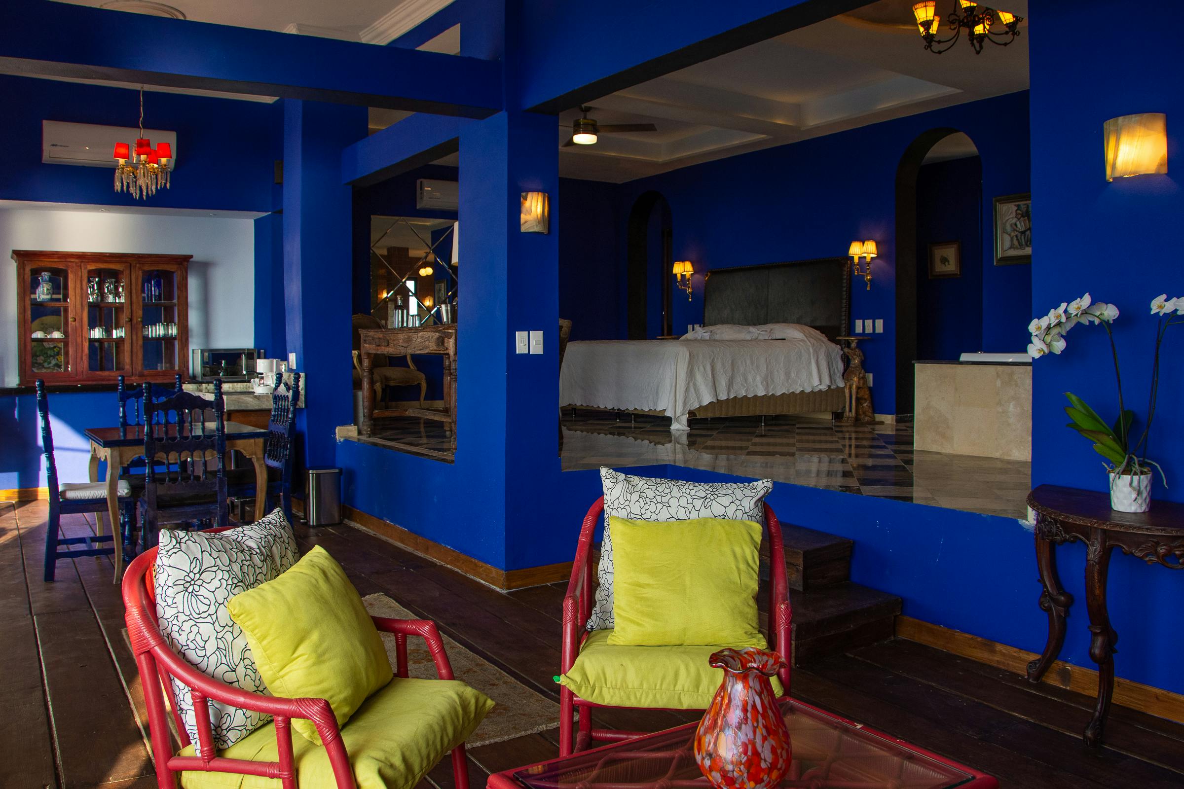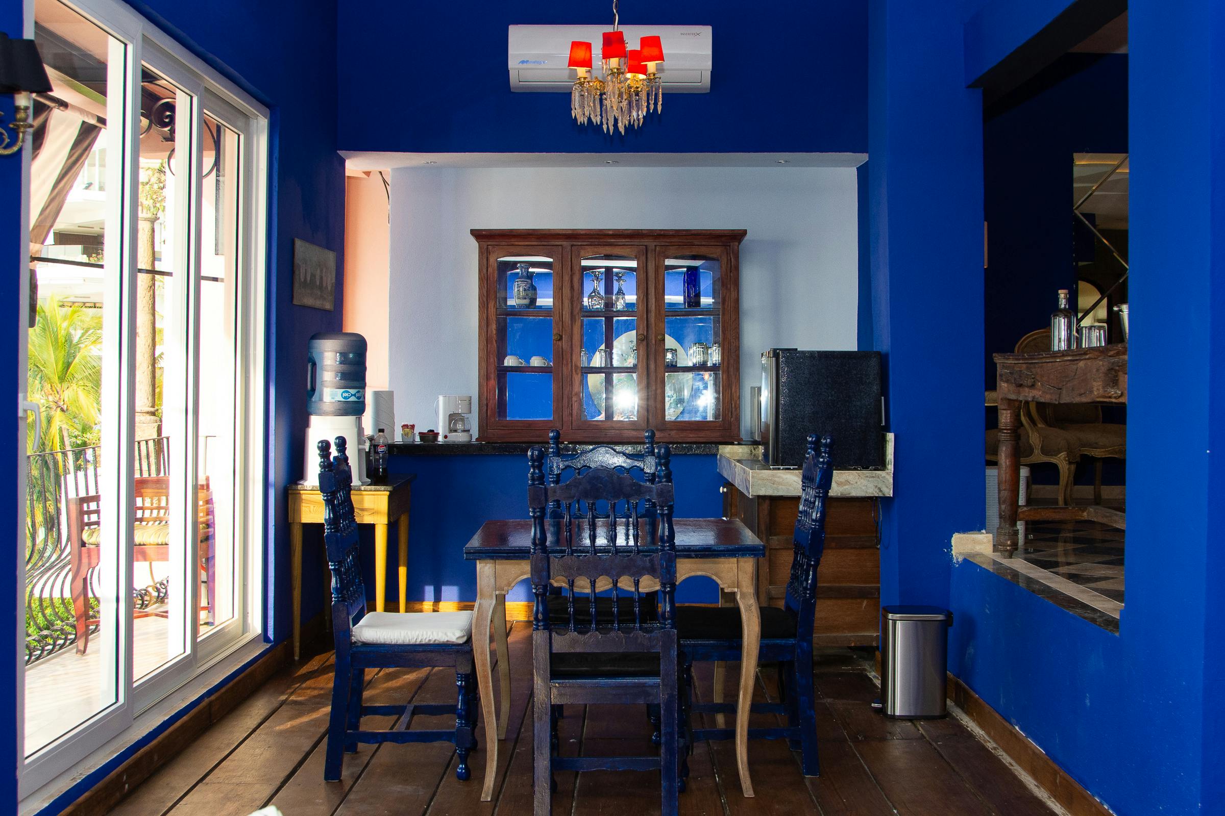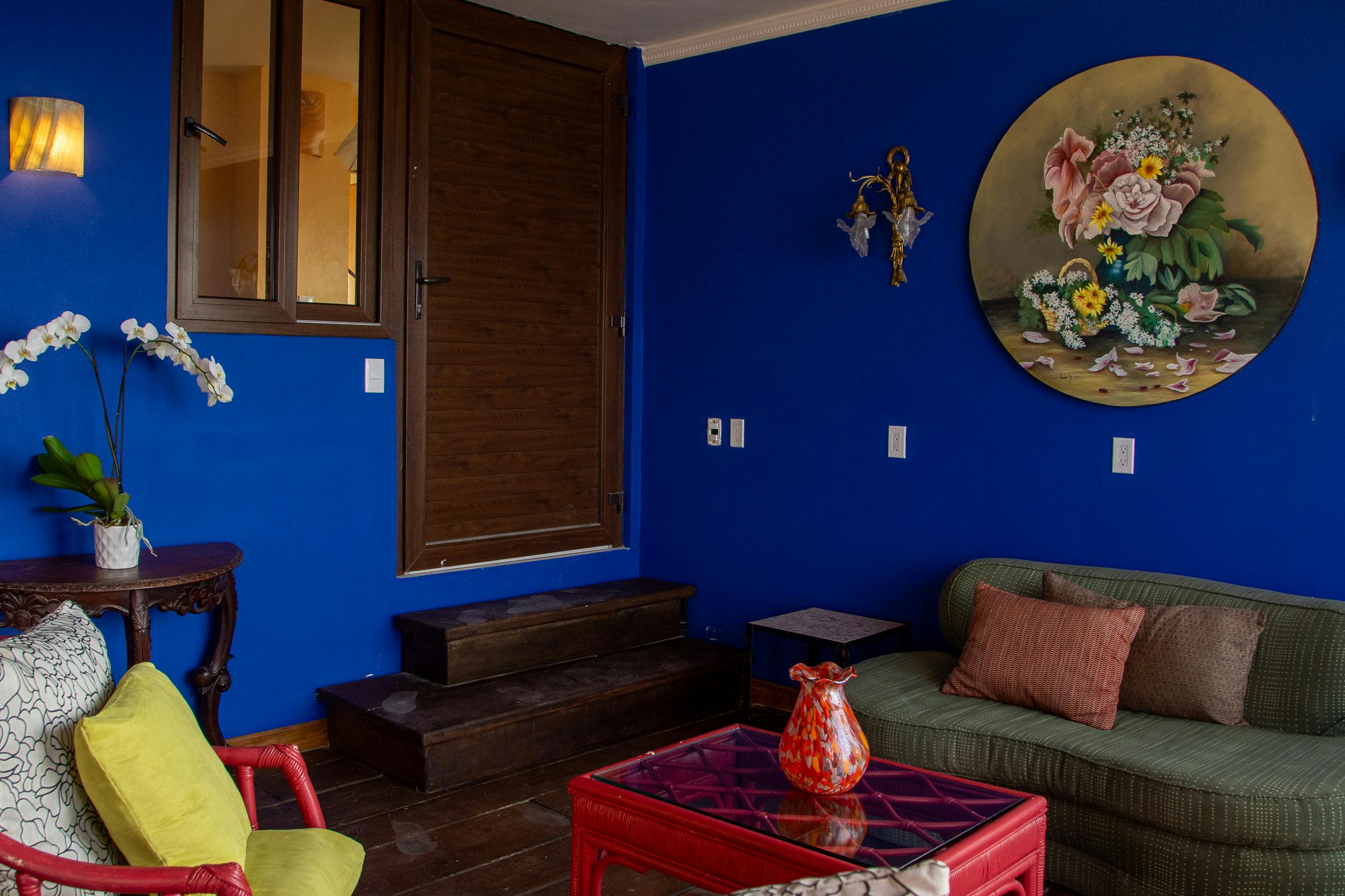 The sitting area, dining room, and kitchen are all part of one large open-air room, beautifully decorated with antiques and original artwork.