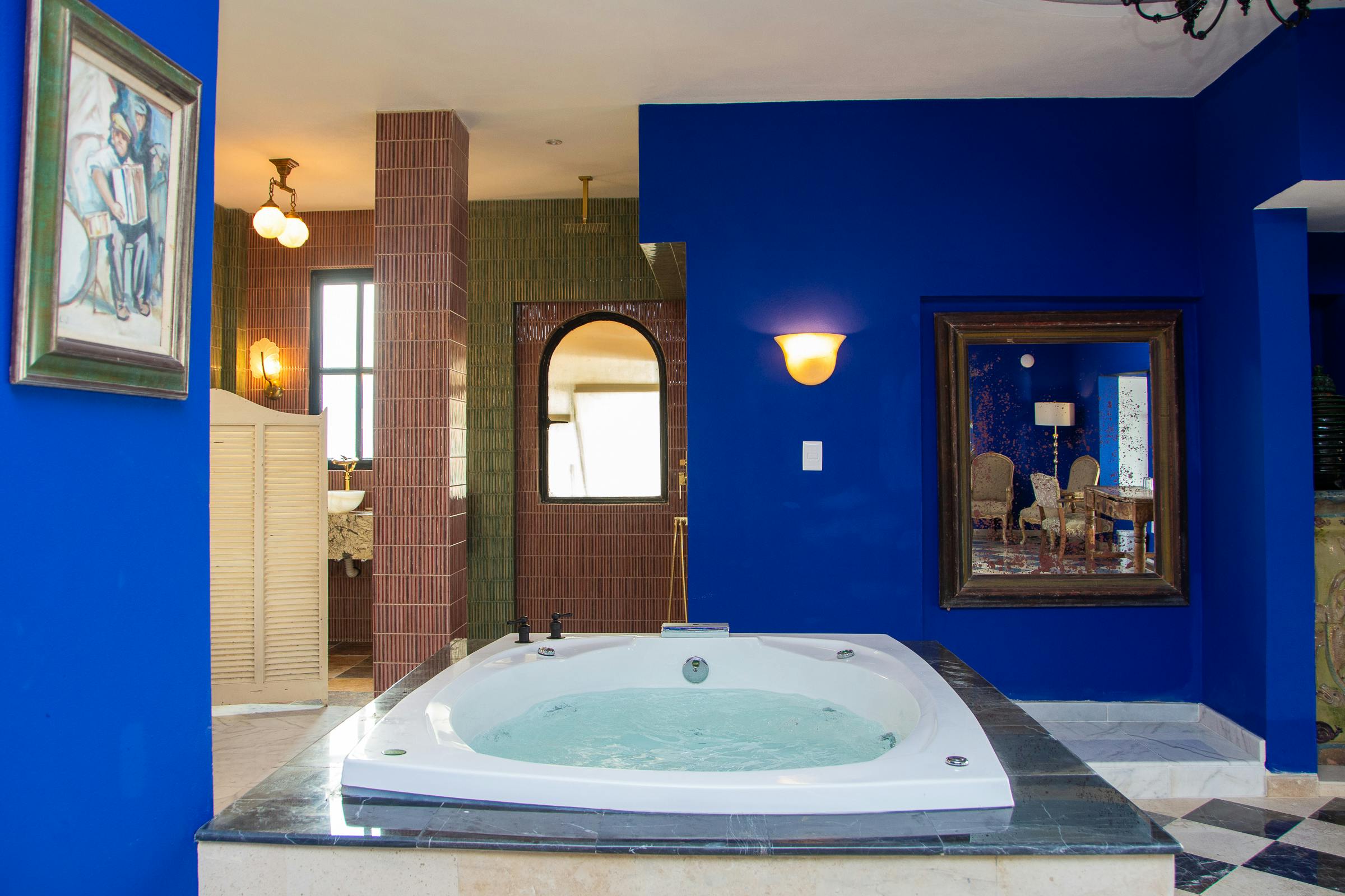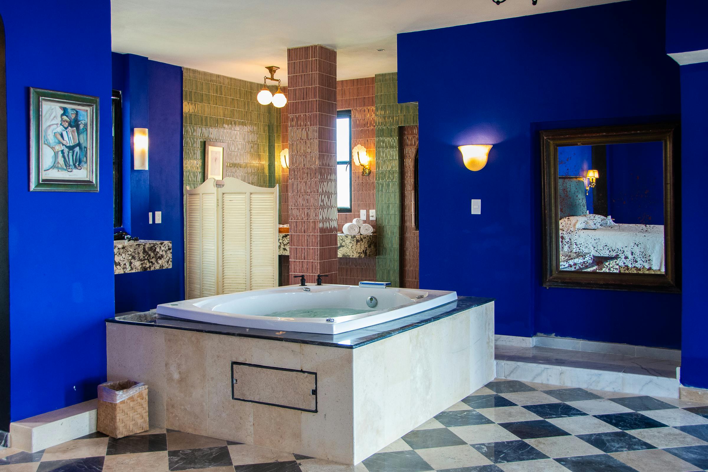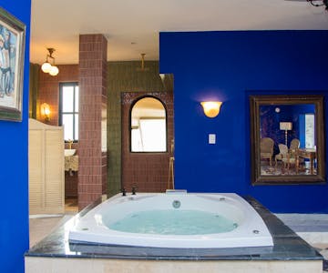 This spacious and luxurious suite features a single, expansive open-concept layout, recently remodeled to create a seamless and indulgent retreat. Designed in elegant royal blue tones, the space feels both refined and inviting. At the heart of the suite is a striking jetted tub, thoughtfully placed within the open space for a truly relaxing experience.