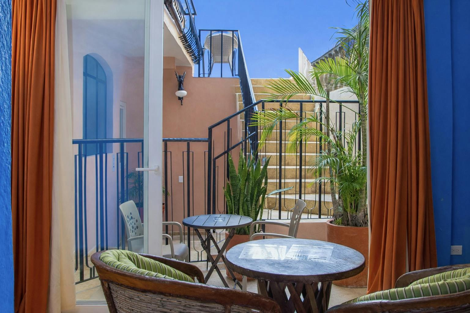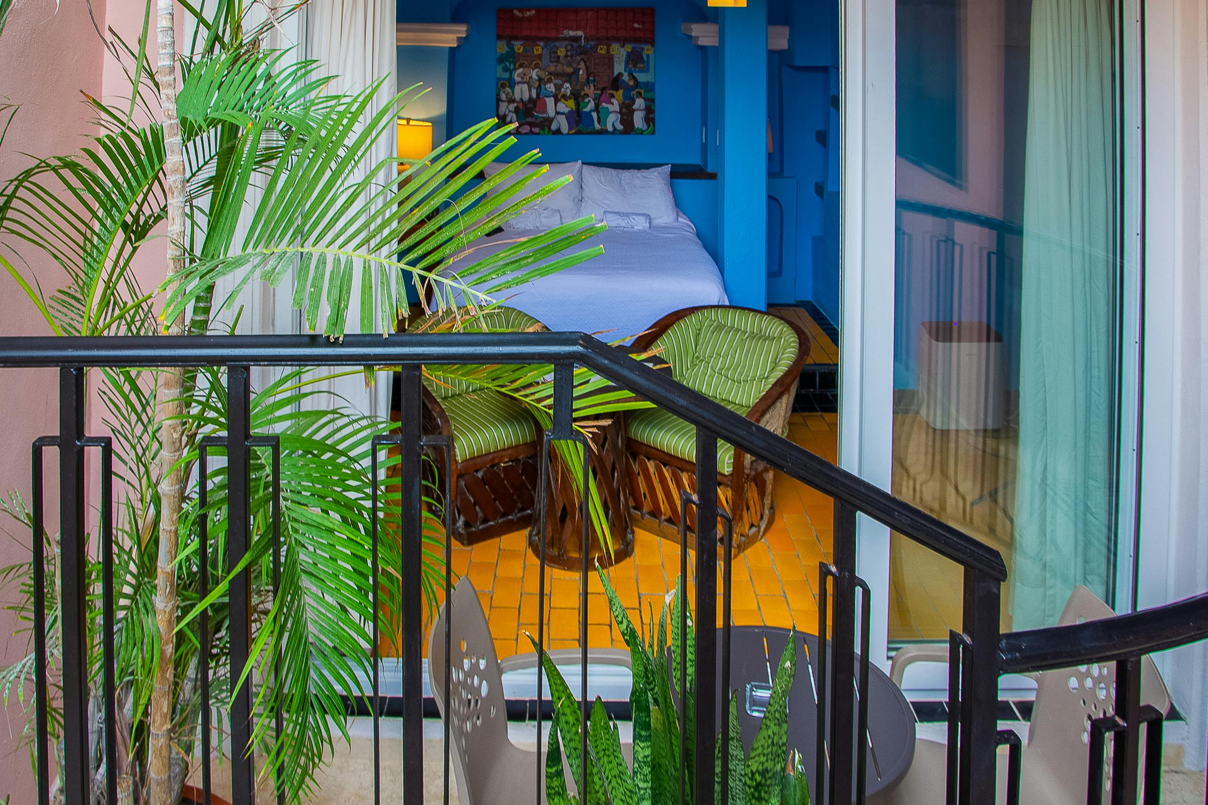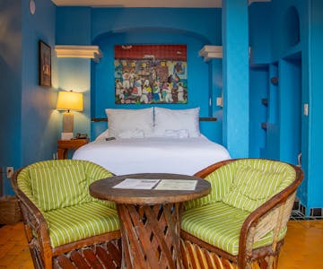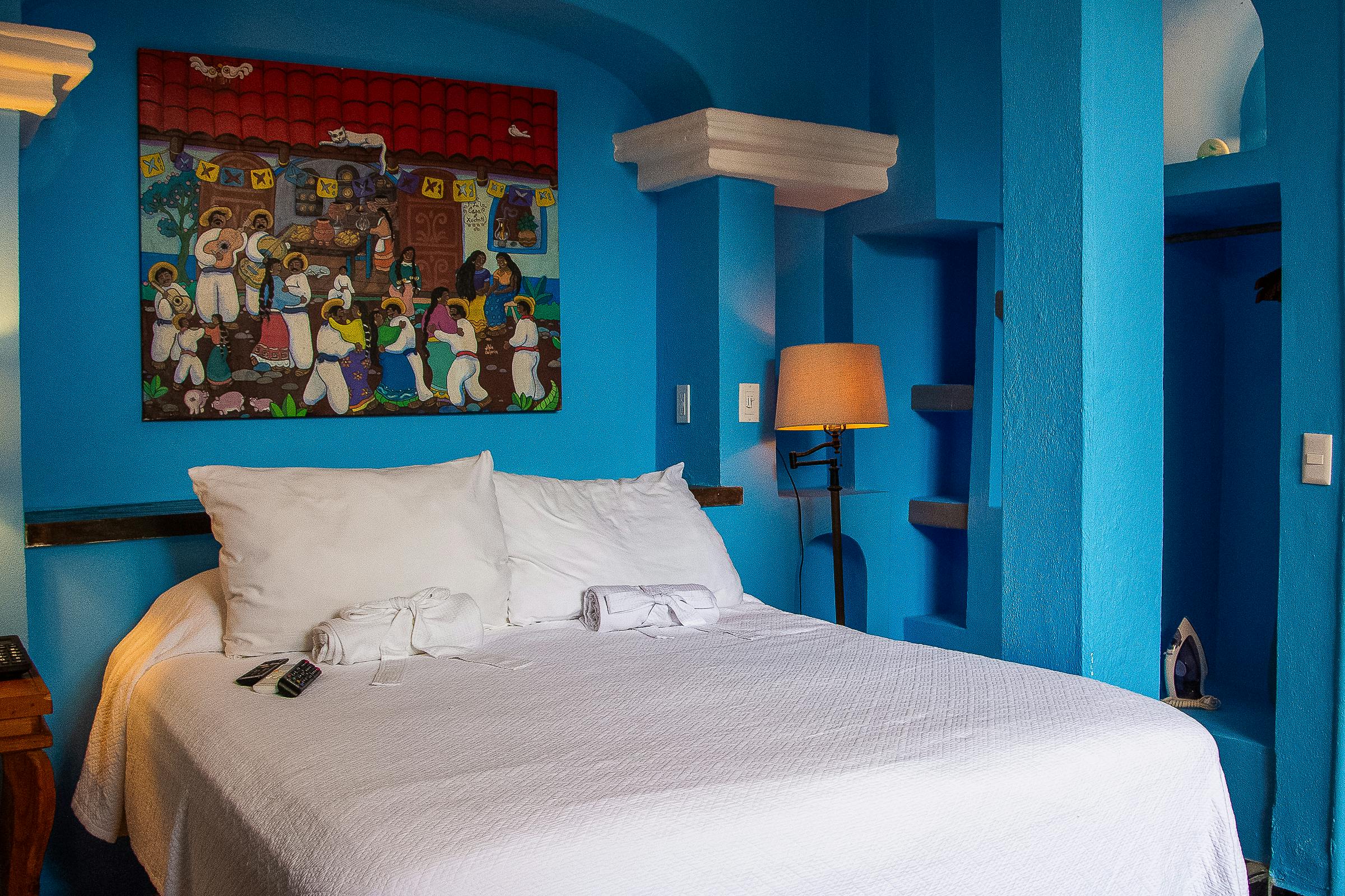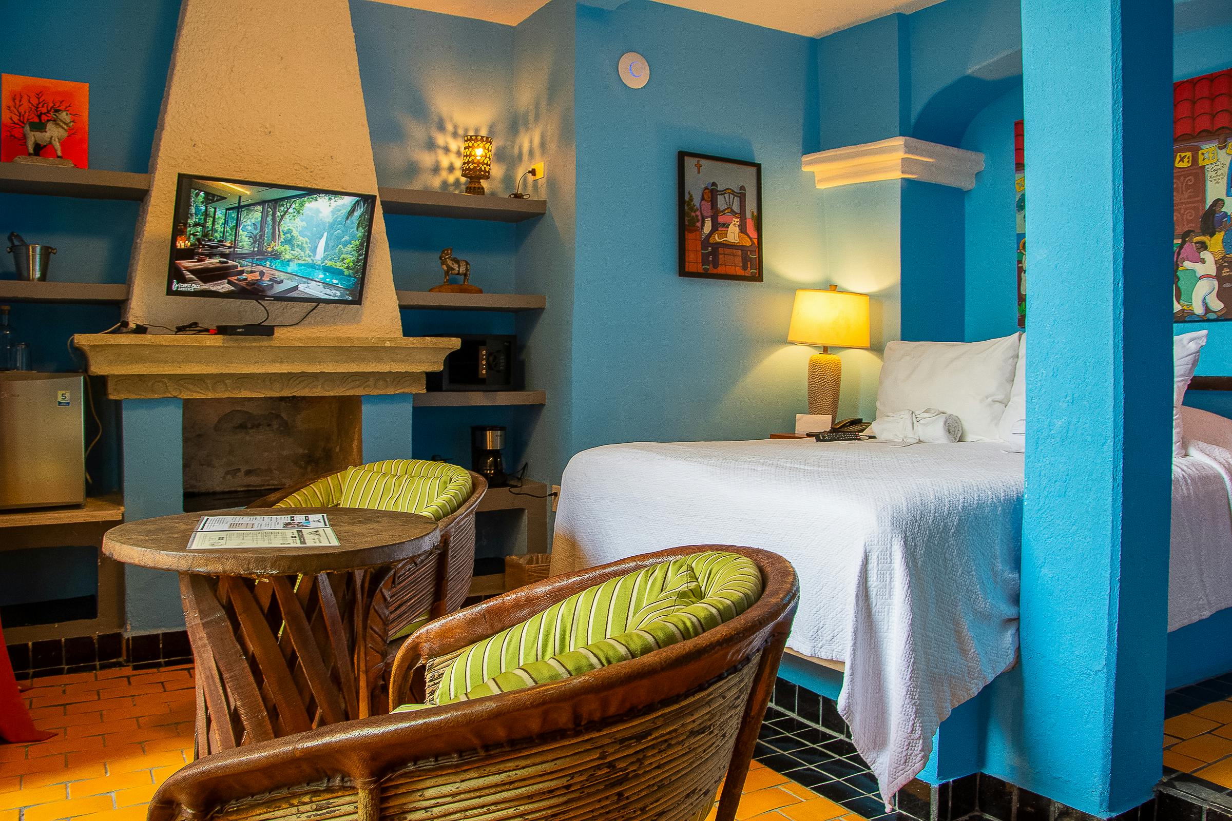 Our Queen Room offers a cozy retreat filled with vibrant character and traditional charm. Featuring a comfortable queen-sized bed, rich blue walls, and handcrafted furnishings, the space blends authentic style with modern comforts featuring a TV, mini fridge, and in-room coffee maker.