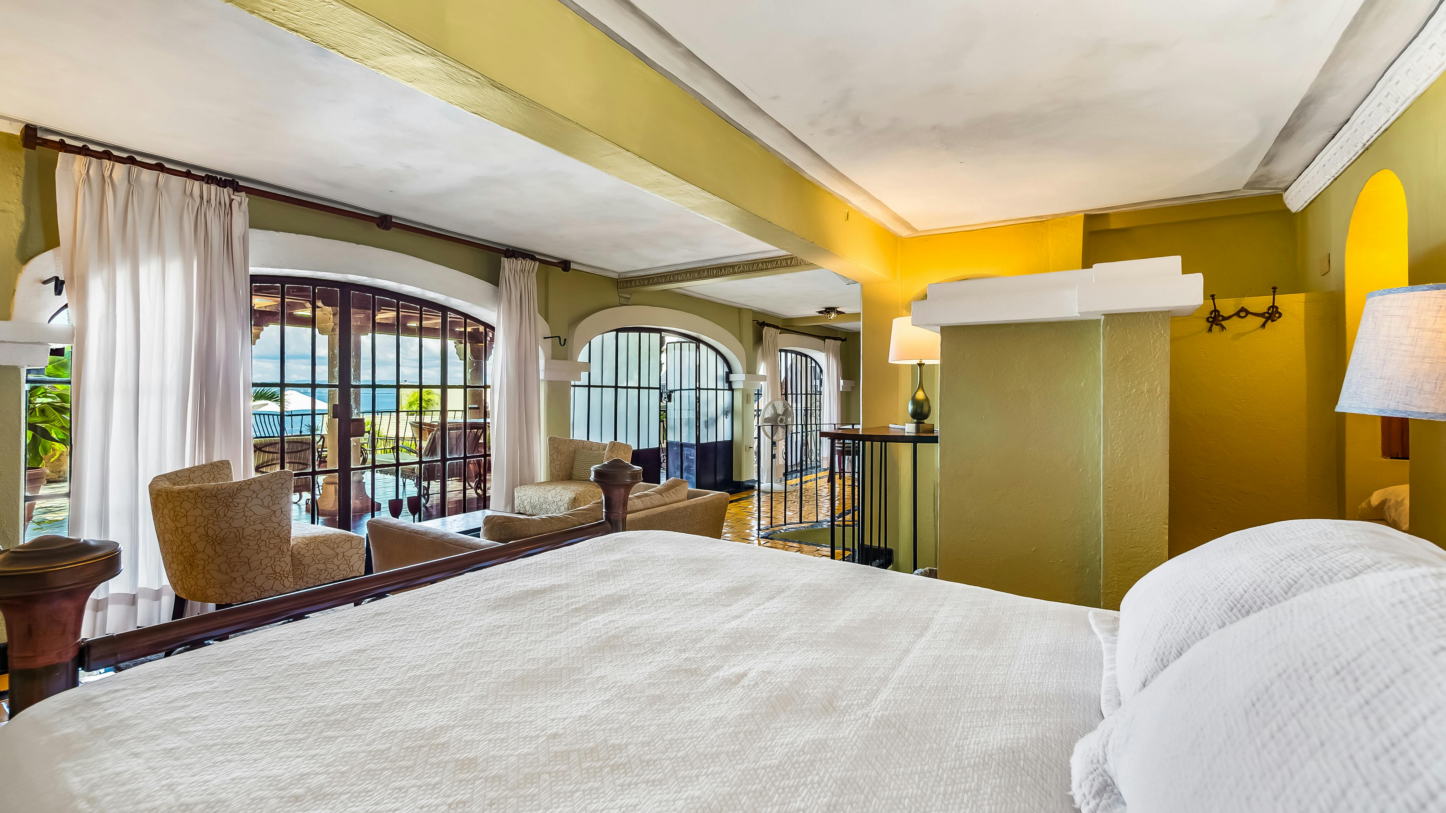 This room features a king-size bed, a striking black-&-white tile bathroom with sunken shower/tub and adjoining kitchenette. Just outside the entrance of Rafael is a private terrace that overlooks the pool and Pacific Ocean. Comfortable lounge chairs on the terrace are a great place to finish your favorite novel or to continue your favorite dream.